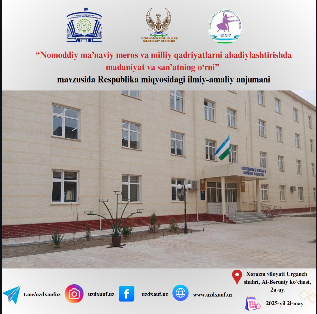 О‘zbekiston Respublikasi Prezidentining 2023-yil 3-iyul “Ma’muriy islohotlar doirasida oliy ta’lim, fan va innovatsiyalar sohasida davlat boshqaruvini samarali tashkil qilish chora-tadbirlari tо‘g‘risida”gi PQ-200-son qarori 9-bandi va О‘zbekiston Respublikasi Oliy ta’lim, fan va innovatsiyalar vazirining 2024-yil 27-dekabrdagi 490-son buyrug‘i bilan tasdiqlangan rejaga muvofiq, О‘zbekiston davlat xoreografiya akademiyasi Urganch filialida 2025-yil 21-may kuni “NOMODDIY MA’NAVIY MEROS VA MILLIY QADRIYATLARNI ABADIYLASHTIRISHDA MADANIYAT VA SAN’ATNING O‘RNI” mavzusida Respublika ilmiy-amaliy anjuman о‘tkaziladi.
